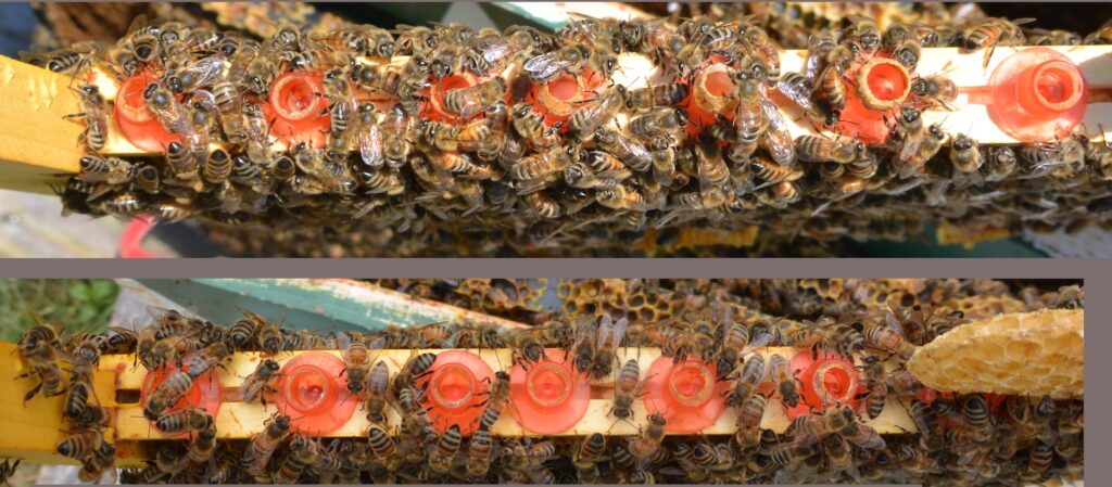 I went out to move my queen frame into a cell finisher and they had uncharged all of the queen cells, and extended the brood comb over the area. Here’s a before & after (May 10 on top and May 13 below). I tried to get them about the same size.