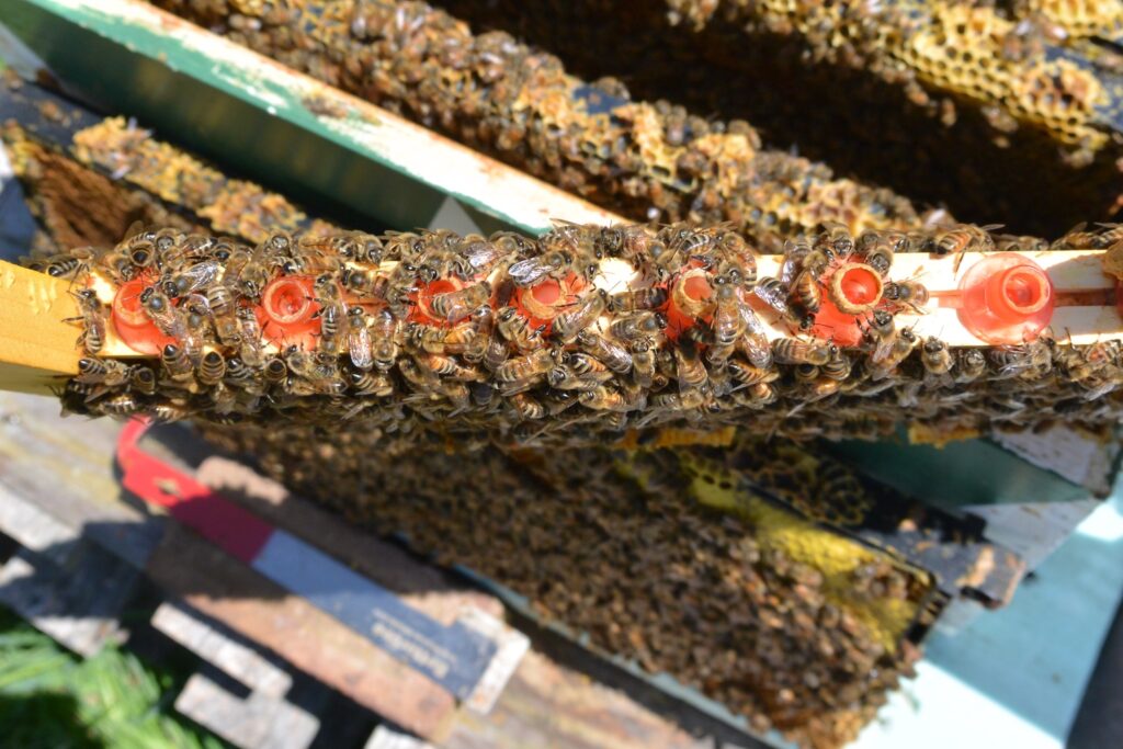 So far the behavior matches my expectations. You can see the queen cups are being worked (they were wax-dipped prior to placement). The workers narrowed the openings on all of the cups — which seems to be the first thing the workers do with the JZBZ cups. (Side note, perhaps another hint at a mechanical trigger to laying fertilized versus unfertilized eggs.) They have not started swarm cells elsewhere, which suggests they’re amenable to doing so where I suggested (on my frame so I can now steal them).